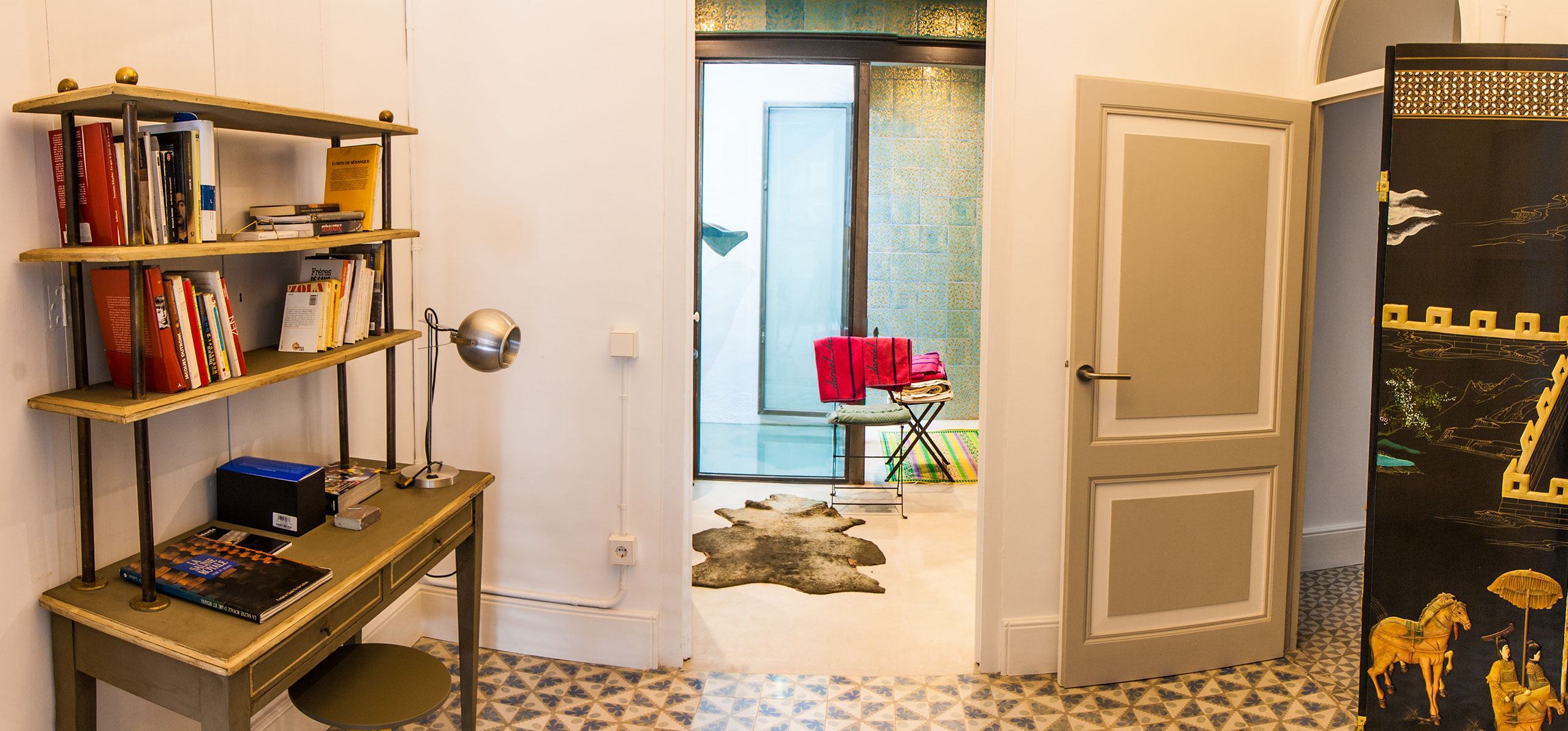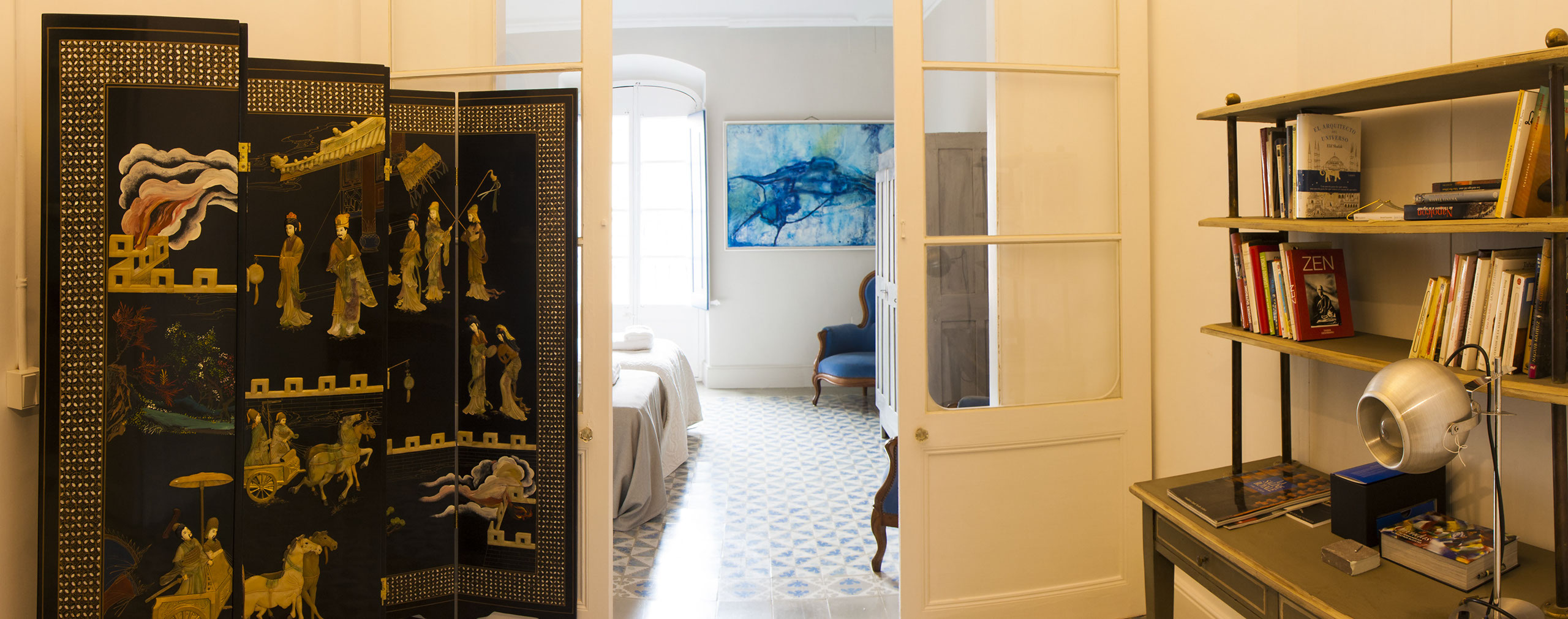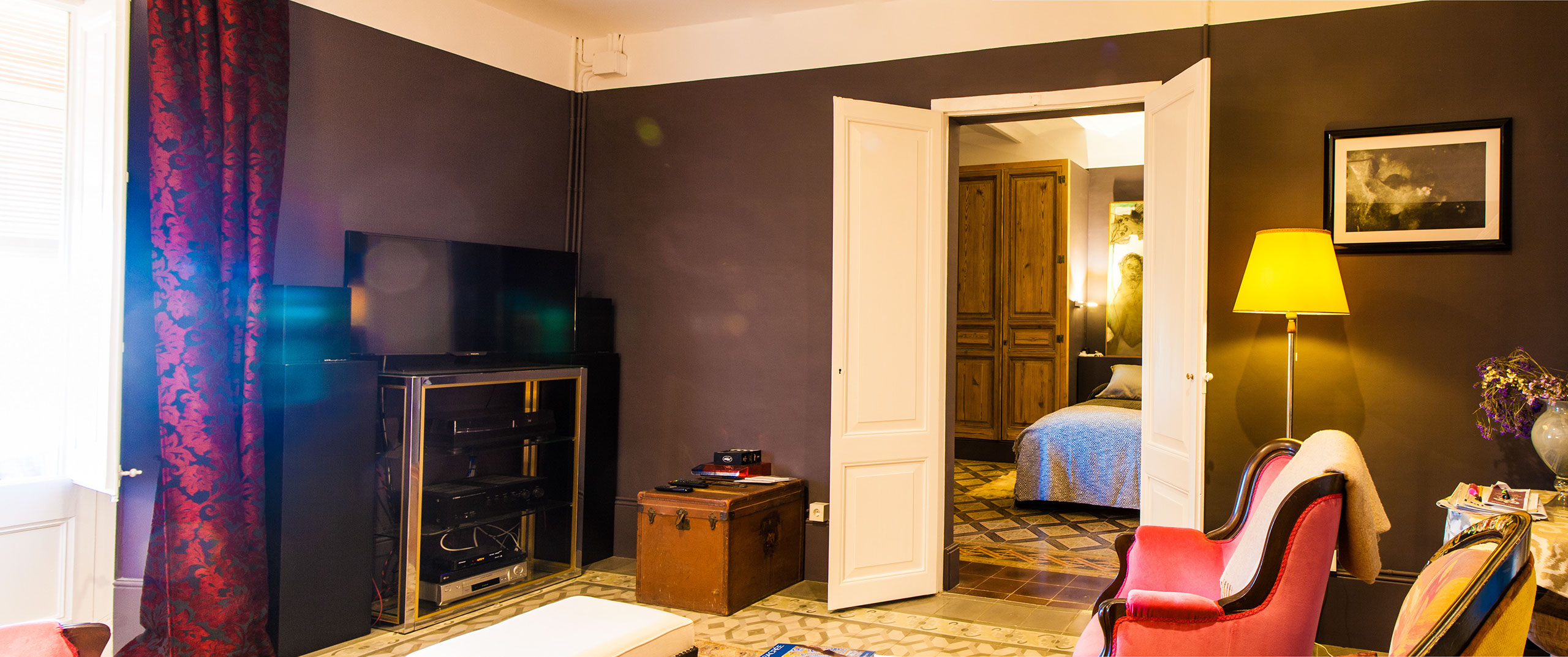 Nommée ainsi pour sa tapisserie originale (1920) en tête de lit – La vaste salle de bains en tedlack vert et faïences artisanales en motifs volutes turquoise et or de La Bisbal – Bien éclairée par un puit de lumière dans lequel est mis en valeur une sculpture originale en bois dur ( équilibre, africain )
