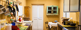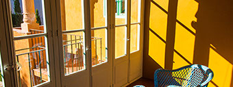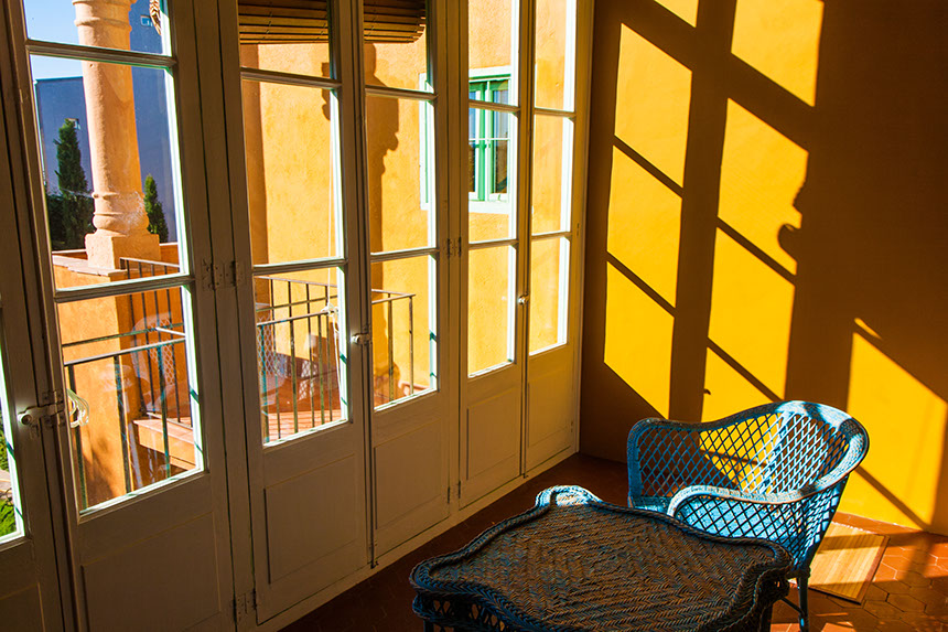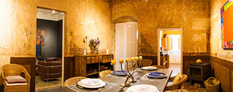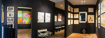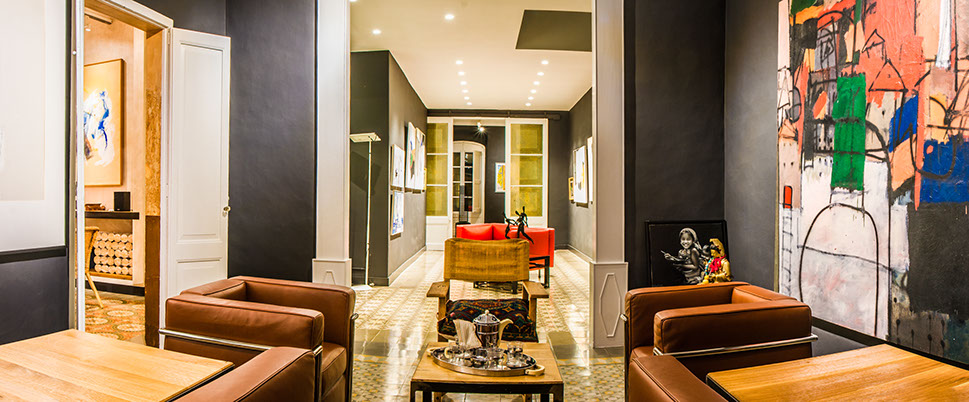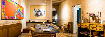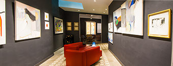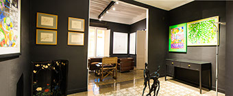 En montant l´escalier d´origine ( 1890) grenat et or et après avoir franchi la porte en bois de chêne vous pénétrez dans l´espace dédié aux arts , les sols sont en carreau ciment mosaïque provenant de la récupération dans des bâtiments anciens et disposés en patchwork pour l´accueil et la salle – à- manger. Et de façon plus conventionnelle pour la galerie salons … les parois de l´ensemble sont noires , afin de mettre en valeur les tableaux exposés, excepté pour la salle-à-manger où nous avons essayé de récupérer les peintures bucoliques de l´époque, impossible, aussi avons nous tout simplement laissé les parois délavées à l´image des anciens palais siciliens.
